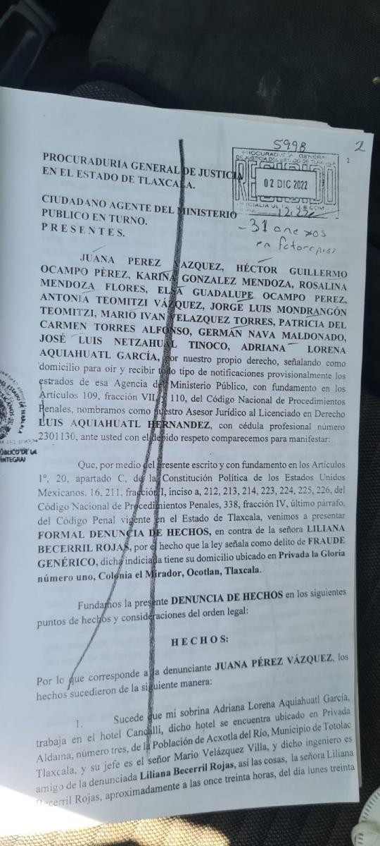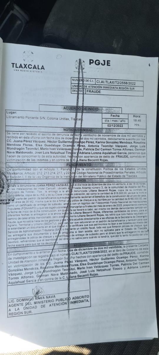 Siguen apareciendo abusos de la excandidata al gobierno del estado, Liliana Becerril, quien fue denunciada ante el Agente del Ministerio Público adscrito a la Unidad de Atención Inmediata, Región Sur, por el delito de fraude baja la carpeta de investigación, CI.AI. Tlax/T2/2558/2022.