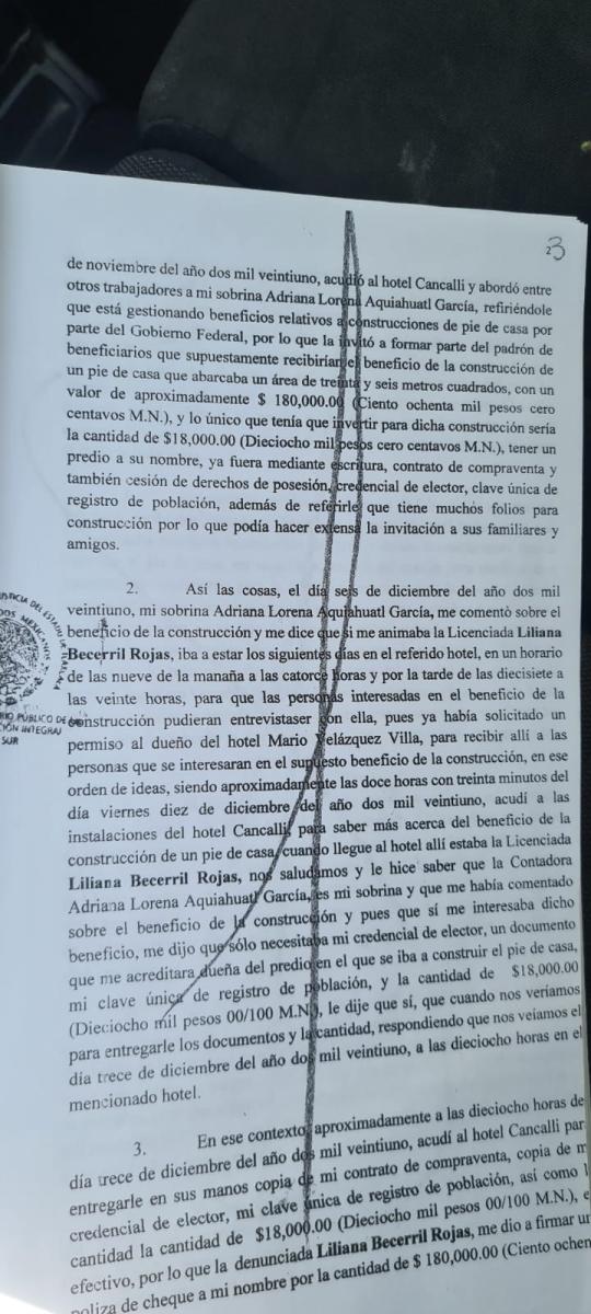 Una de las denunciantes refirió que un familiar le informó que la excandidata fifí, estaba ofreciendo la construcción de 36 metros cuadrados con un valor de 180 mil pesos, sin embargo, el beneficiario solo tenía que aportar 18 mil pesos, además de contar con la escritura del terreno, credencial de elector y la Clave Única de Registro de Población (CURP).