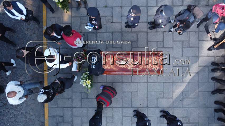 Tlaxcala, Tlax.-15-Julio-2023. Esta mañana, en la presidencia municipal de San Pablo Apetatitlán, se llevó a cabo el homenaje de cuerpo presente de la oficial Erika Morales, quien falleció en cumplimiento de su deber el pasado miércoles 12 de julio.