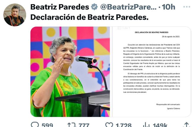 La exgobernadora de Tlaxcala y aspirante a la presidencia de la República, Beatriz Paredes Rangel, sostuvo a través de un comunicado dado a conocer en sus redes sociales que antes de que tome una decisión, se deben conocer los resultados de las encuestas aplicadas, esto en relación a la declaración realizada por el dirigente nacional del Partido Revolucionario Institucional (PRI), Alejandro Moreno Cardenas.