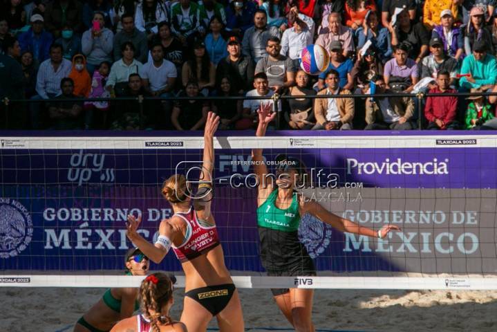 Tlaxcala, Tlax. 10-10-2023.Teniendo como escenario el Museo de Arte de Tlaxcala (MAT), la dupla femenil mexicana de voleibol de playa conformada por Atenas Gutiérrez y Abril Flores, pierden ante sus homólogas de Austria, con un marcador final de dos sets a uno.