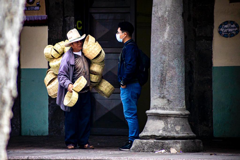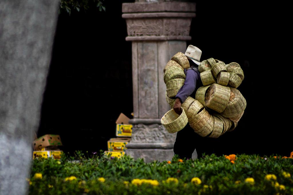 Tlaxcala, Tlax. 30-10-2023. Un hombre de avanzada edad, se dedica caminar por el centro histórico de la ciudad de Tlaxcala, ofreciendo sus productos mejor conocidos como “chiquihuites”, mismos que maneja en varias medidas y los cuales se ocupan en estas fechas para depositar tortilla, fruta o el tradicional pan de muerto.