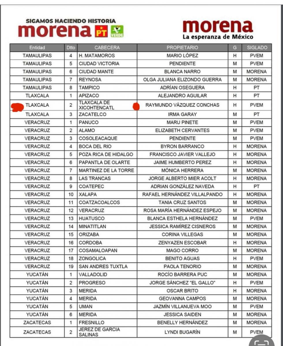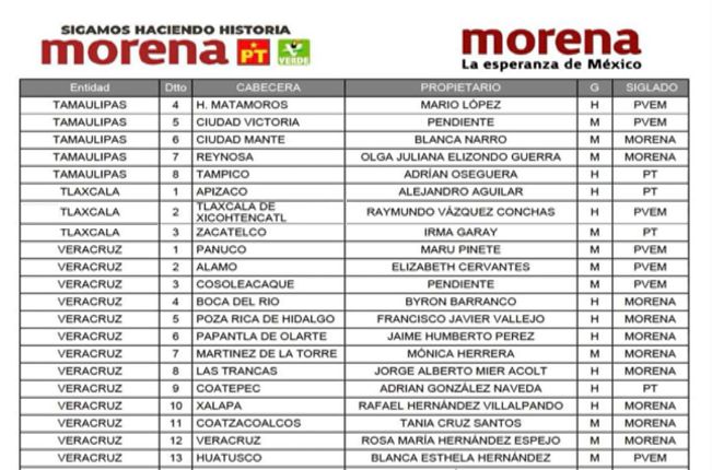 Después de semanas de mantener en zozobra a militantes y simpatizantes, finalmente se dio a conocer la lista de quienes serán los abanderados a las diputaciones federales en los tres Distritos de Tlaxcala por parte de la coalición que encabeza en Movimiento de Regeneración Nacional (Morena) junto al Partido del Trabajo (PT) y el Partido Verde Ecologista de México (PVEM).