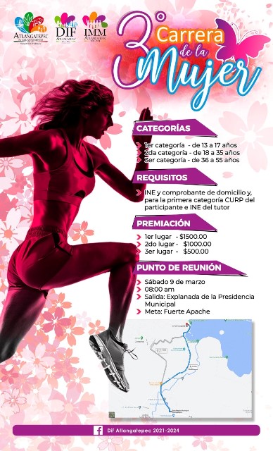 El Ayuntamiento que encabeza el presidente municipal, Alfredo Ponce Hernández, anunció la carrera de la mujer que se desarrollará el próximo nueve de marzo en las inmediaciones de Atlangatepec.