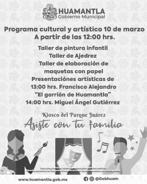 Finalmente, la Coordinación de Cultura, informa que, cada domingo se contará con una programación distinta para seguir dando vida al Parque Juárez; por lo que invita a artistas, colectivos y artesanos a seguir participando en este espacio que es de todos los huamantlecos.