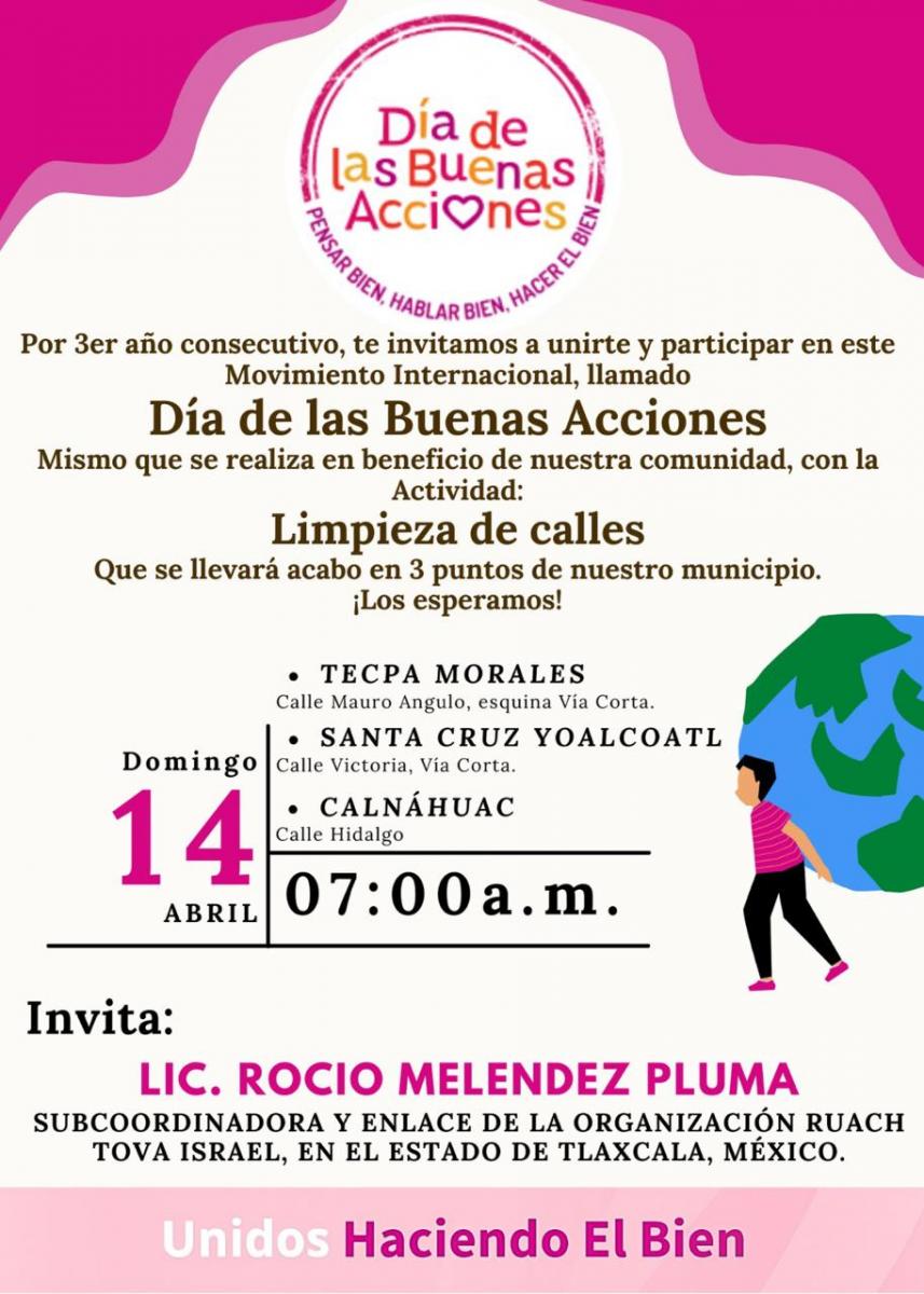 Un total de 115 países se unirán en la celebración de la 18va edición del "Día de las Buenas Acciones", y en México la representante de la asociación Ruach Tova Israel, Rocío Meléndez Pluma, convocó a realizar una jornada de Limpieza de Calles en la Magdalena Tlaltelulco, Tlaxcala.