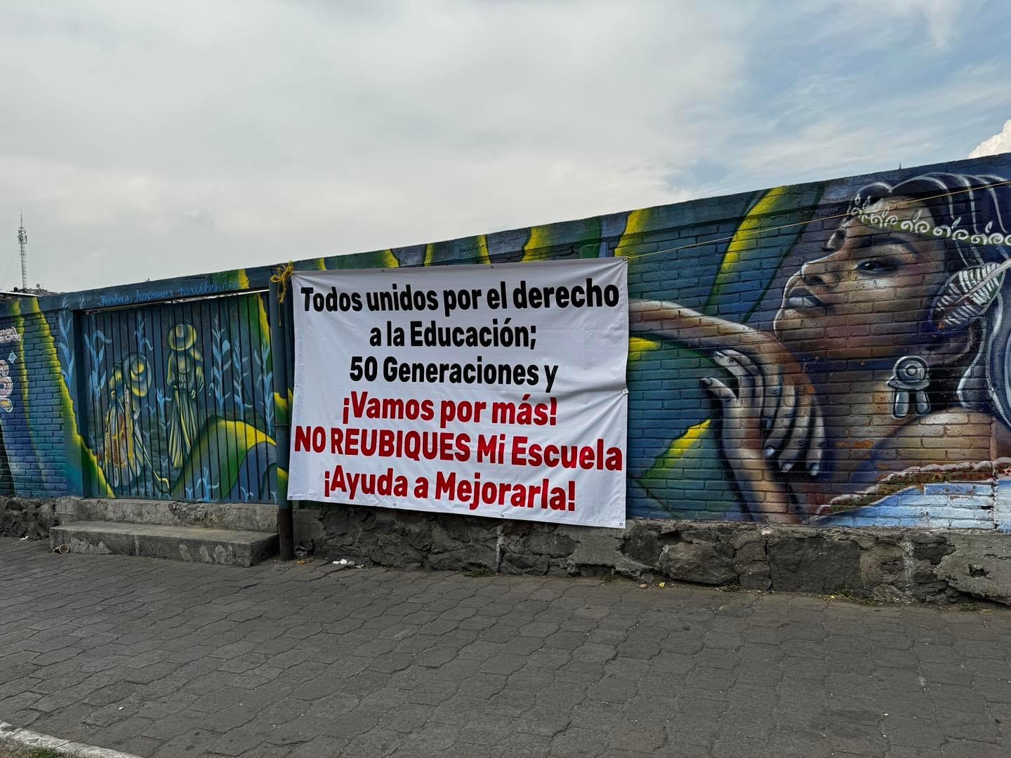Por esta situación, la comunidad escolar ha colocado mantas al exterior del plantel manifestando su oposición a la reubicación de la escuela.