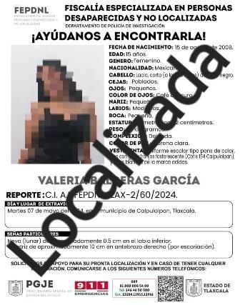 Elementos de la Policía de Investigación adscritos a la Fiscalía Especializada en Personas Desaparecidas y No Localizadas (FEPDNL) de la Procuraduría General de Justicia del Estado (PGJE) localizaron a una menor de edad reportada como desaparecida.