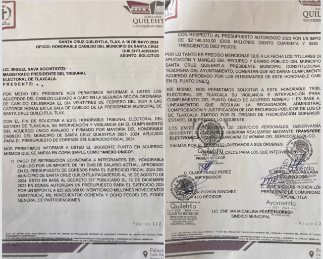 De manera ilegal tres regidores y el presidente de comunidad de Ayometitla, perteneciente al municipio de Quilehtla presentaron ante el Tribunal Electoral de Tlaxcala (TET) un medio de impugnación para exigir el pago de dos millones de pesos por concepto de liquidación por sus servicios ante la población.
