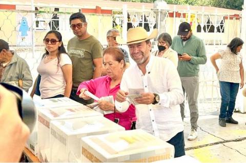 El candidato a diputado federal de la coalición “Sigamos Haciendo Historia” en el segundo Distrito, Ray Vázquez Conchas, acudió la mañana de este domingo a ejercer su derecho como ciudadano y votar en la casilla 443 de la capital del estado.