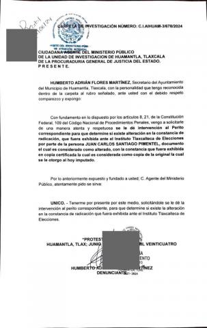 Este caso ha sido remitido a la Unidad de Investigación de Huamantla, perteneciente a la Procuraduría General de Justicia del Estado (PGJE), quienes asumirán la responsabilidad de llevar a cabo la investigación, luego de que la autenticidad del documento ha sido cuestionada.