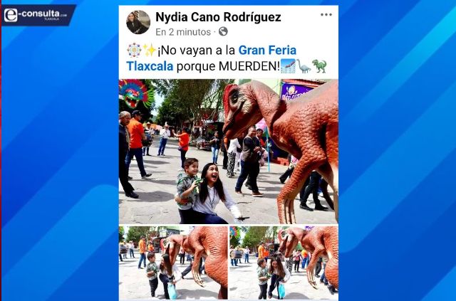 Una publicación que hizo Nydia Cano Rodríguez, directora del Instituto Estatal de la Mujer, en la red social de Facebook para bromear sobre la presencia de dinosaurios en el recinto ferial y recomendar a sus seguidores que no fueran a la gran feria de Tlaxcala porque mordían, desató el enojo de los usuarios que le recordaron que esa recomendación la hubiera hecho para alertar sobre sus perros que se sospecha hace unas semanas atacaron en el municipio de Amaxac a un hombre hasta matarlo.