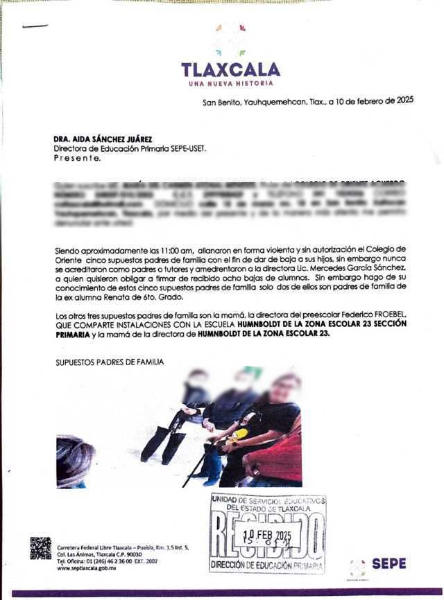 Se denuncia ante autoridades de la SEPE-USET a la directora del Preescolar  Federico Froebel C.C.T.  Mariela Carrasco García y a la mamá de la directora del Colegio Humboldt Christian Carrasco García por el delito de suplantación de identidad, allanamiento, tomar video sin autorización amedrentar e incitar a la violencia.
