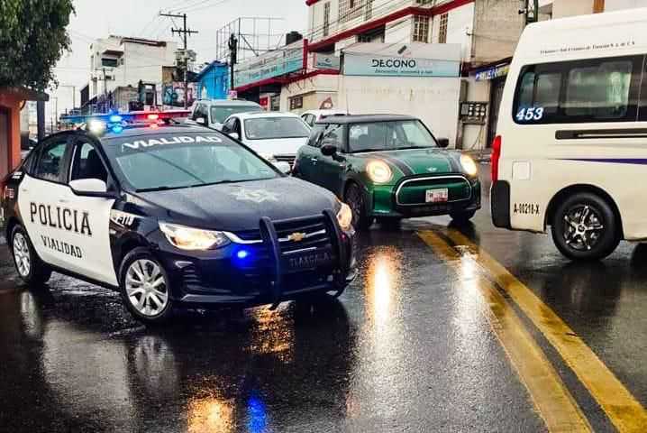 Entre las acciones realizadas destaca el apoyo en el abanderamiento y desvío de la circulación en zonas como Ocotlán, donde se registraron fuertes encharcamientos y un par de unidades particulares varadas.