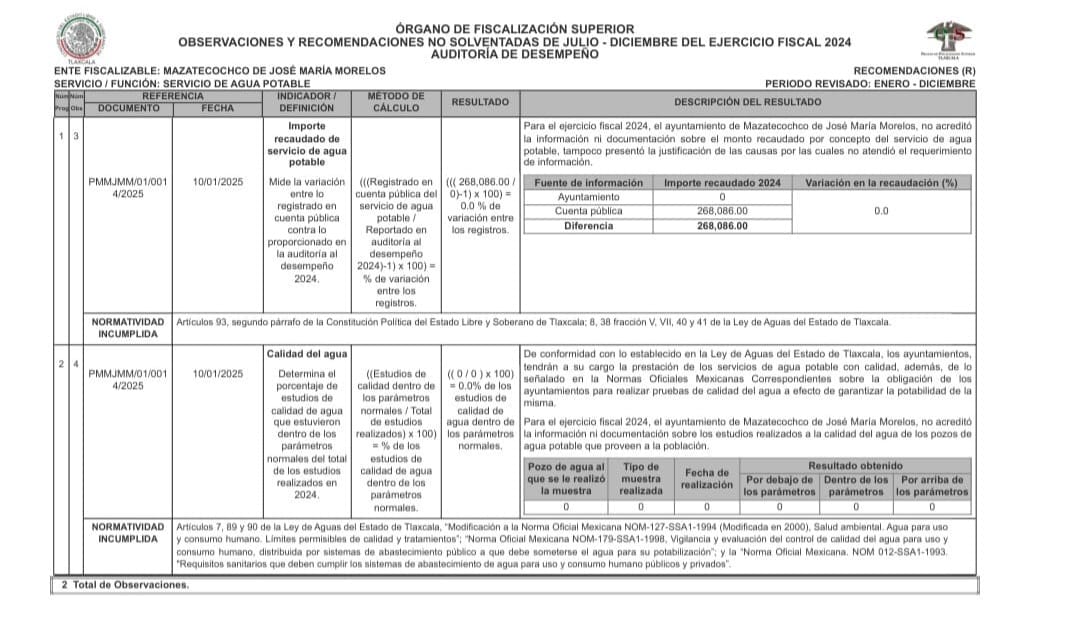 Es importante mencionar una de las observaciones que realizó el Órgano de Fiscalización Superior a la cuenta pública del segundo semestre de 2024 del municipio de San Cosme Mazatecochco, fue precisamente sobre la Dirección de Agua Potable, donde de plano no cumplió con ninguno de los requisitos establecidos, creando amonestaciones económicas y evidenciando la falta de conocimiento para gobernar tanto del alcalde "borrachín" como de su personal que solo fue premiado con direcciones por ser amigos de parranda dejando a la deriva tan importante área.