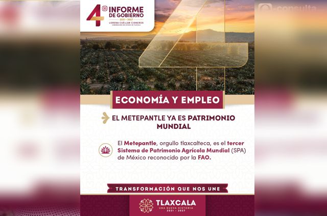 La imagen que circula en redes sociales es el colmo de la desfachatez. En su afán por inflar su currículum político, la gobernadora presenta el Metepantle como un “éxito de su gestión”. En la publicidad oficial se puede leer: 4.º Informe de Gobierno, Lorena Cuéllar Cisneros. ECONOMÍA Y EMPLEO: EL METEPANTLE YA ES PATRIMONIO MUNDIAL. “Metepantle, orgullo tlaxcalteca, es el tercer Sistema de Patrimonio Agrícola Mundial (SPA) de México reconocido por la FAO. Transformación que nos une”.