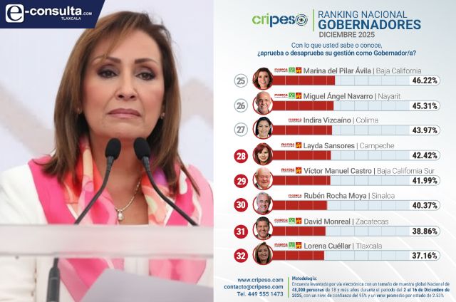 En la más reciente medición de desempeño de los gobernadores de México, publicada por la encuestadora CRIPESO el 18 de diciembre de 2025 (con datos recolectados entre el 2 y el 15 de diciembre), la gobernadora de Tlaxcala, Lorena Cuéllar Cisneros, se hunde una vez más en la posición más baja y deshonrosa: el lugar 32 de 32, con un mísero 37.16% de aprobación general.