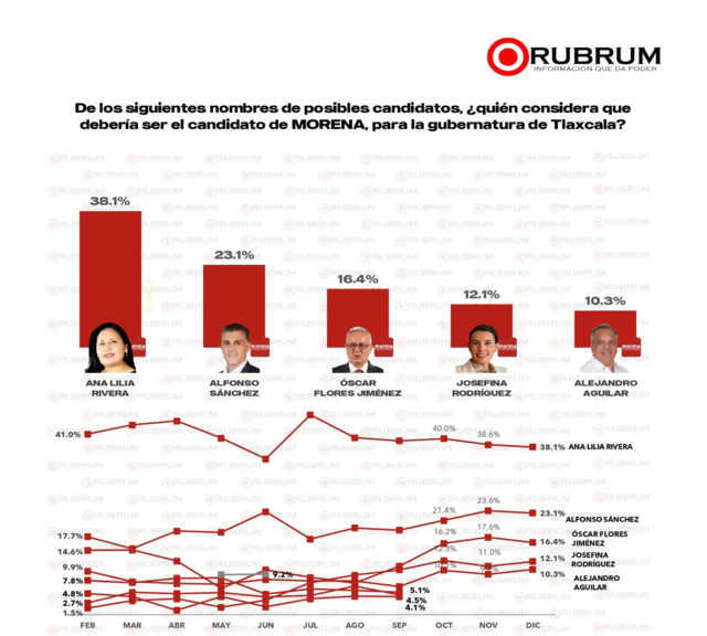A dos años de la elección para renovar la gubernatura en Tlaxcala, la empresa encuestadora Rubrum reveló un nuevo estudio que coloca a Morena como el partido con mayor respaldo ciudadano y a la senadora Ana Lilia Rivera como la figura mejor posicionada dentro de ese instituto político.