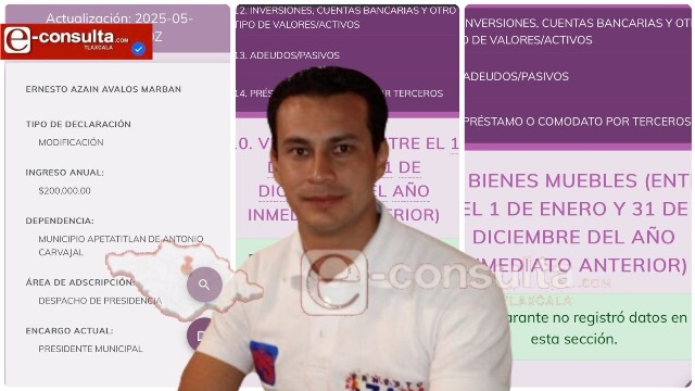 La credibilidad del presidente municipal de Apetatitlán, Azaín Ávalos Marbán, se encuentra en entredicho luego de que su declaración patrimonial oficial exhibe cifras que no coinciden con la realidad que muestra su estilo de vida, generando sospechas de ocultamiento de bienes, ingresos y propiedades.