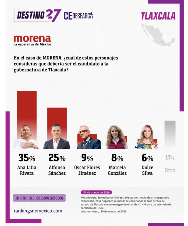 De acuerdo con el estudio levantado el 30 de marzo de 2026, Rivera Rivera alcanza un 35% de preferencia como posible candidata de Morena, superando por 10 puntos al alcalde capitalino Alfonso Sánchez García, quien se ubica con el 25%. Más atrás aparecen otros perfiles como Óscar Flores Jiménez y Marcela González.