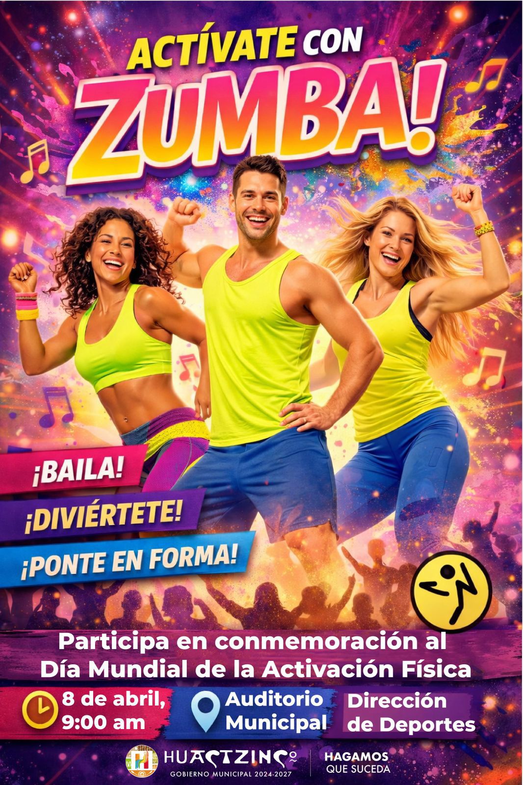 El H. Ayuntamiento de Huactzinco a través de la dirección de Deportes en conmemoración al día mundial de la actividad física, te invita a una clase gratuita de zumba.