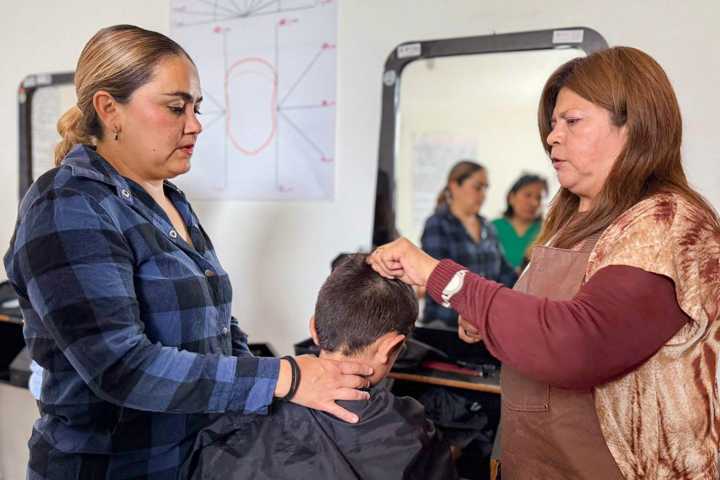 De manera paralela, otro grupo de mujeres cursa el taller de cortes de cabello nivel básico, donde adquieren conocimientos sobre técnicas modernas tanto para hombres como para mujeres, ampliando así sus oportunidades en el ámbito de los servicios personales.