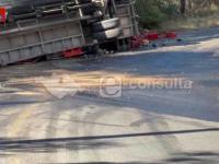 El accidente se registró cuando la unidad, que transportaba bebidas azucaradas, perdió el control por causas que aún se investigan, quedando volcada a un costado de la vía.