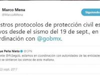 Permanecen activos protocolos de protección civil: Marco Mena A través de su cuenta de Twitter, el Gobernador Mena informó que los cuerpos de emergencia en la entidad se mantienen alertas y en coordinación con el Gobierno Federal. Leer más sobre Permanecen activos protocolos de protección civil: Marco Mena