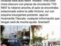 A través de las redes sociales buscan automóvil robado Emilio PiedrasEl vehículo fue hurtado sobre el Boulevard del Maestro en la colonia Xicohténcatl en la capital del estado Leer más sobre A través de las redes sociales buscan automóvil robado